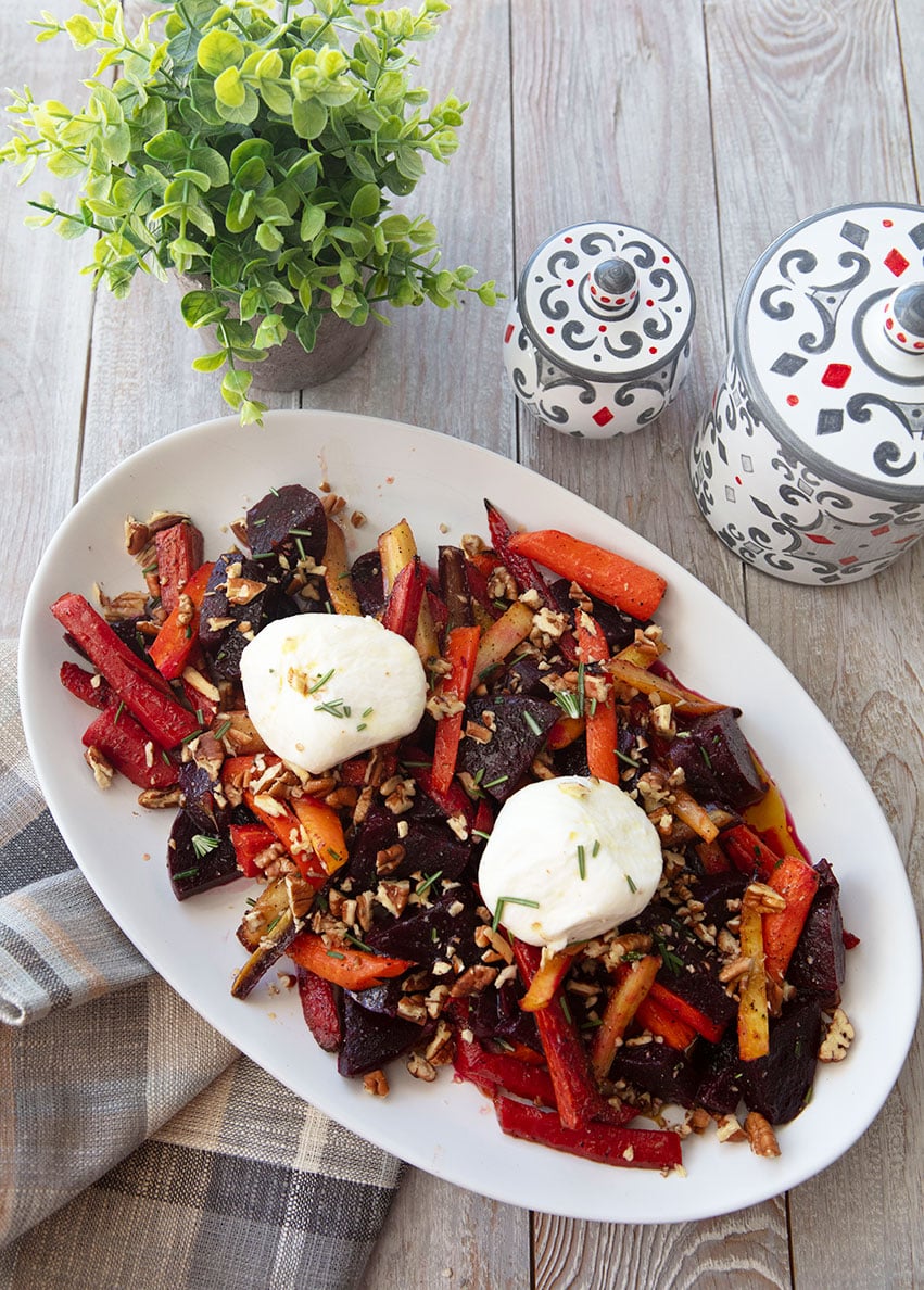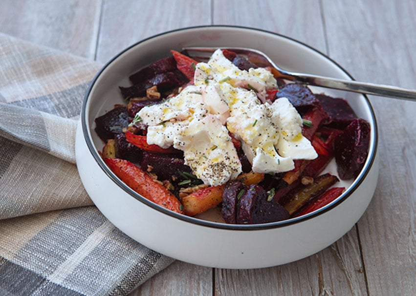 Sweet roasted beets and carrots are paired with creamy burrata and finished with a tangy apple cider–honey dressing for a simple yet elegant dish.